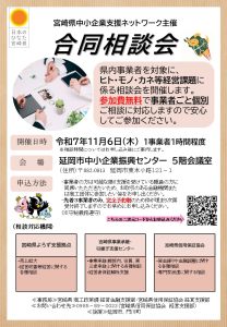 宮崎県中小企業支援ネットワークでは、県内事業者様を対象に、ヒト・モノ・カネ等の経営課題に関する合同相談会を延岡市にて開催いたします。